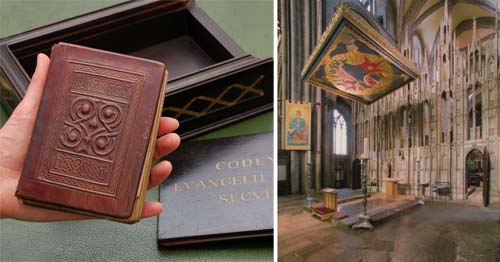 Today at St. Alban’s we had available for veneration the first class relic of another great English saint, St. Cuthbert the bishop and confessor, as well as that of his biographer St. Bede the Venerable. St. Cuthbert was Bishop of Lindisfarne, Durham, born about 635; died 20 March, 687. His emblem is the head of St. Oswald, king and martyr which he is represented as bearing in his hands. He was probably born in the neighborhood of Mailros (Melrose) of lowly parentage, for as a boy he used to tend sheep on the mountain-sides near that monastery. While still a child living with his foster-mother Kenswith his future lot as bishop had been foretold by a little play-fellow, whose prophecy had a lasting effect on his character. He was influenced, too, by the holiness of the community of Mailros, where St. Eata was abbot and St. Basil prior.